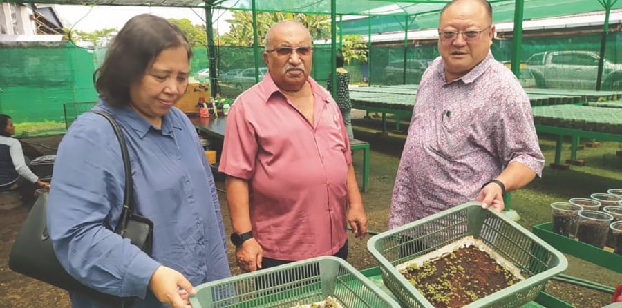 MPMA chairman Datuk Wira Sheikh Othman Rahman (centre) and deputy chairman Datuk Chua Hock Gee (right) looking at the tissue culture eucalyptus seedlings.