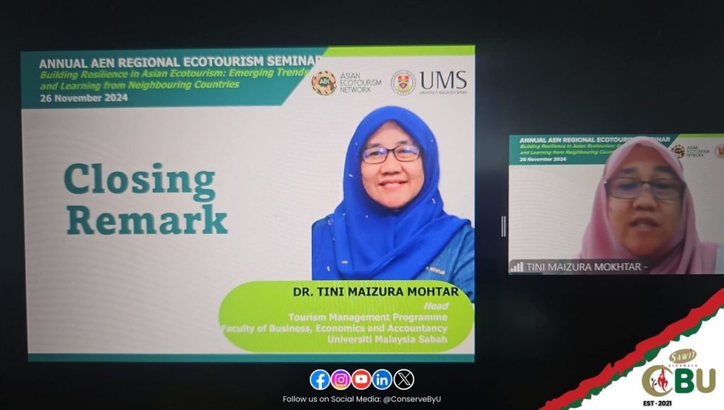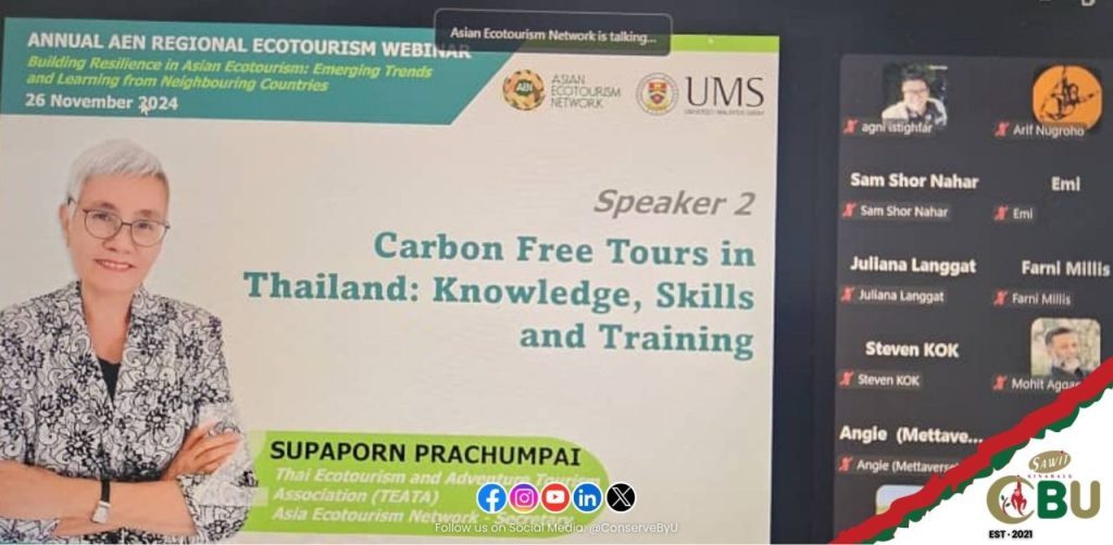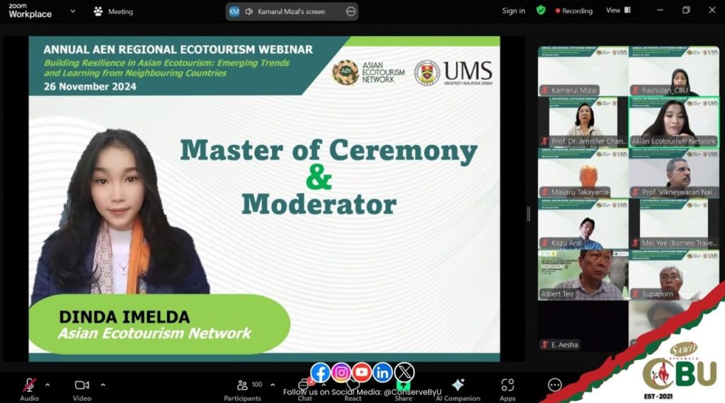 The Conservation & Biodiversity Unit represented by Mdm Rashidah M. participated in the Zoom Webinar on Resilience in Asian Ecotourism: Emerging Trends and Learning from Neighboring Countries as part of the Asean Ecotourism Network (AEN) Exchange Learning Webinar Series #3-2024.